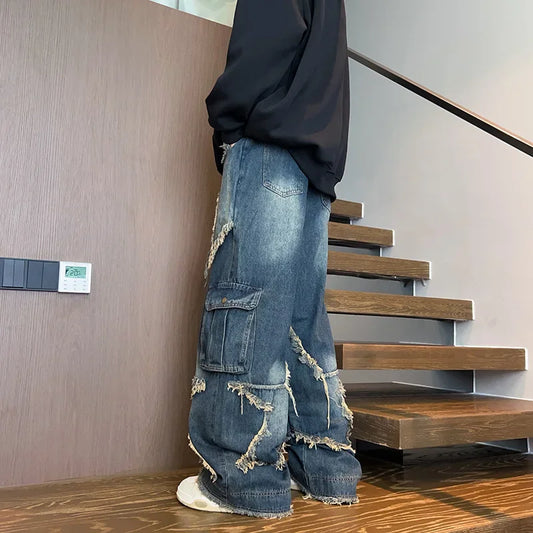 saferido Trendy Star-printed Men's Jeans Loose-fit Hip-hop Style Casual Trousers Wide-leg American Style Functional Working Pants