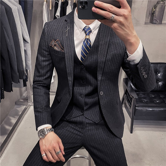 Male Korean Blazers Slim Check British Business Suit Men Three Piece Wedding Bridegroom Man Dress