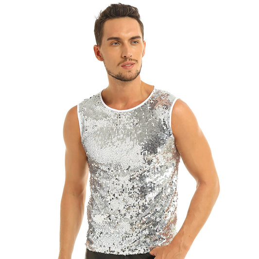 Mens Tank Tops Summer Sleeveless Crew Neck Sequin Slim Fitted Vest Tank Top Tee T-shirts Festival Rave Party Clubwear