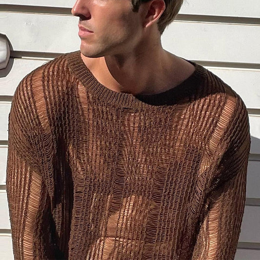 New Arrivals Autumn Sexy Hollow Mesh Knit T-shirts Men Streetwear Pullovers Solid Long Sleeve Crew Neck Tees Mens Clothing