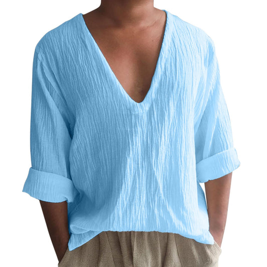 Vintage Imitation Linen Shirt Men Breathable Casual Long Sleeve Oversize Tops Summer V Neck Boho Style Mens Shirts ์๋ฅ ะะพััะฐ