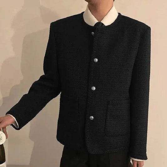Tops Korean Style New Men's Woven Texture Shirts Casual Streetwear Male Solid Collarless Long Sleeved Blouse S-5XL