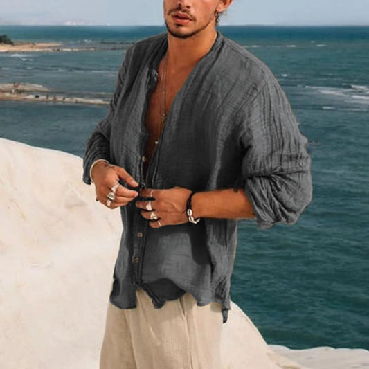 Vintage Men Loose Solid Shirts Stand Collar Long Sleeve Tops Spring Summer Casual Cardigan Retro Shirt Mens Clothes Streetwear
