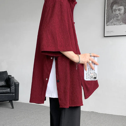 Wine Red Side Buttons Pleated Shirt Black Apricot Harajuku Button Up Korean Short Sleeve Aesthetic Male Shirts Men Blouse