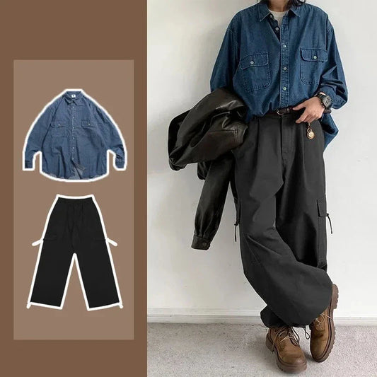 Spring Casual Men Set Retro Simplicity Pocket Denim Shirt+big Pocket Street Hip-hop Cargo Pants 2-pcs Japanese Fashion Suit