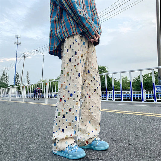 Spring autumnNew Casual Trousers Mens Loose Casual Elastic Waist Cargo Pants Retro jacquard Printed Pant