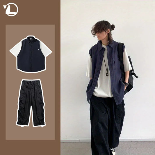 Summer Casual Men Set Japanese Patchwork Fake Two Half Sleeved Shirts+Pockets Cargo Pants 2-piece Set Couple Short Sleeve Suit