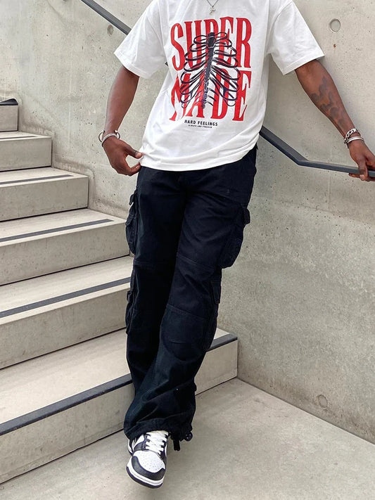 Black/white Casual Pants Men's Fashion Loose Straight Wide Leg Pants Men Streetwear Hip-hop Pocket Cargo Pants Mens Trousers
