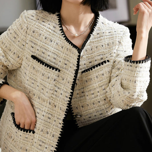 2025 High-end contrasting color Xiaoxiangfeng coat, spring and autumn white tweed short women's coat, spring new women's clothing