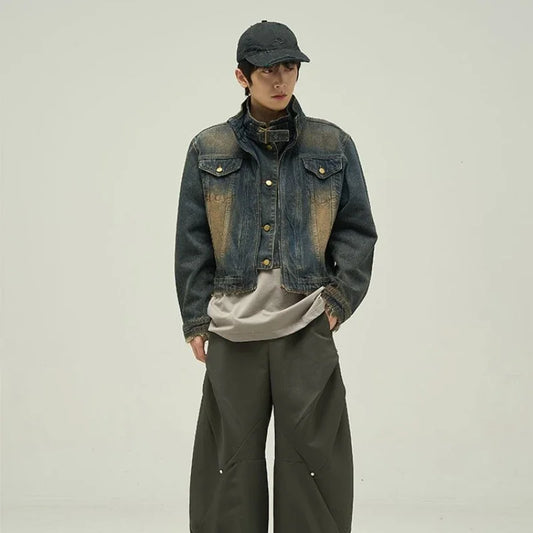 Mens Denim Jacket American Vintage Fake Two Pieces Design Washed Trend Jeans Coat Male Hip Hop High Collar Unisex Outwear 2024