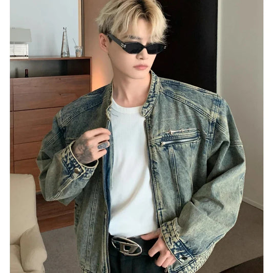 Motorcycle Washed Denim Jacket Men American Street Hip Hop Metal Design Distressed Coat Zipper Pocket Loose Jeans Jacket Unisex