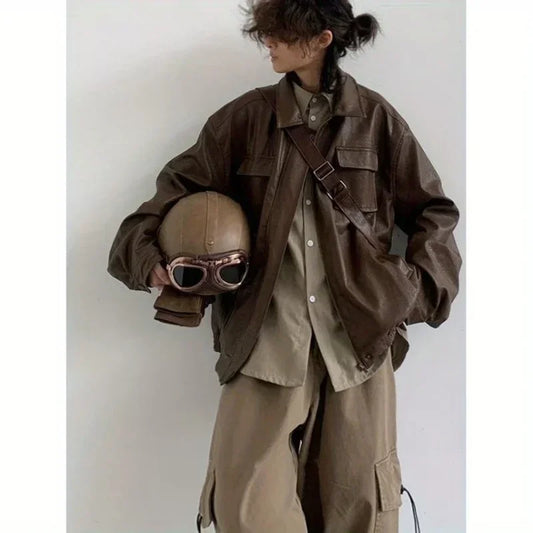 Motorcycle Leather Jacket Men Bomber Pilot Retro Loose Pu Short Coat Japanese Casual Streetwear Multi Pocket Trend Outwear New