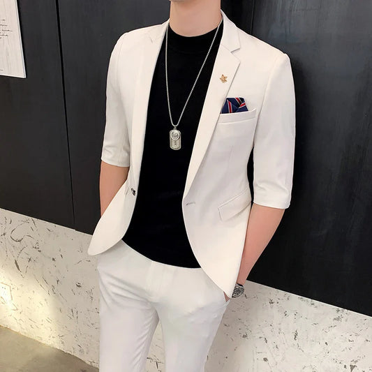 saferido (Jackt+Pant) 2 Pcs Set Men Suits Half Sleeve Spring Summer Slim British Short Sleeve Blazer Coat Trend Male Designer Tuxedo