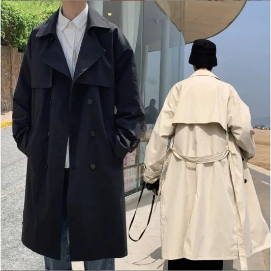 saferido Korean Style Trench Men Coat Trendy Streetwear Windbreaker Trenchcoat Solid Business Casual Streetwear Loose Long Overcoat