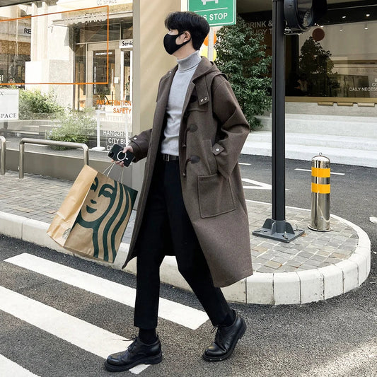 saferido Korean-style Woolen Trench Men Horn Button Casual Long Windbreaker Winter Hooded Jacket Coats Fashion Trenchcoat