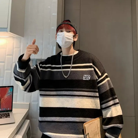 saferido Literature and Art Men's Loose Stripe Round Neck Knitwear Men's Autumn Oversize Lazy Sweater men coat winter clothes sweter