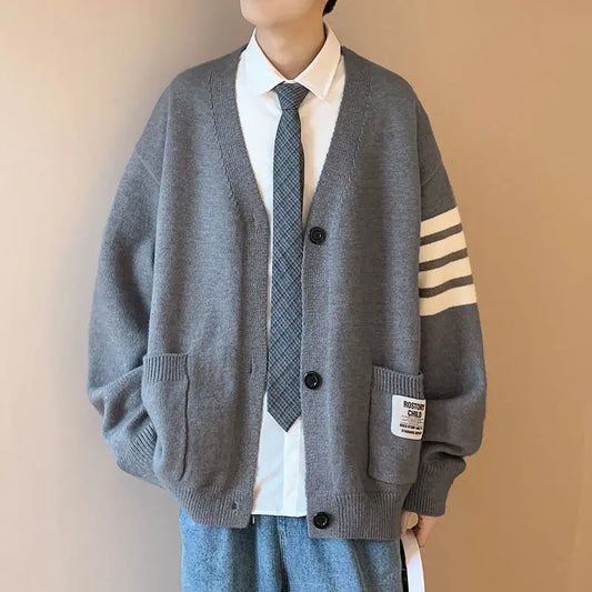 saferido Men Korean Clothes Hoodie with Pockets Striped Knitted Sweaters for Men Cardigan Jacket Coat Fun Korean Autumn Loose Fit Warm