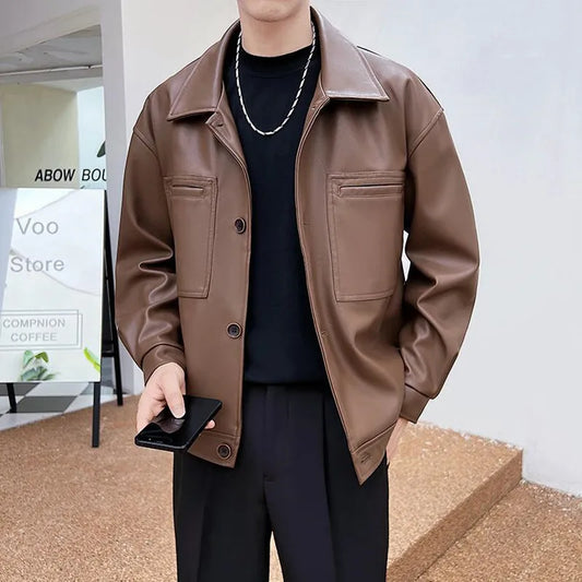 saferido Men PU Leather Jackets High Street Turn-down Collar Zipper Pockets Solid Color Male Short Coat 2024 Spring New Chic