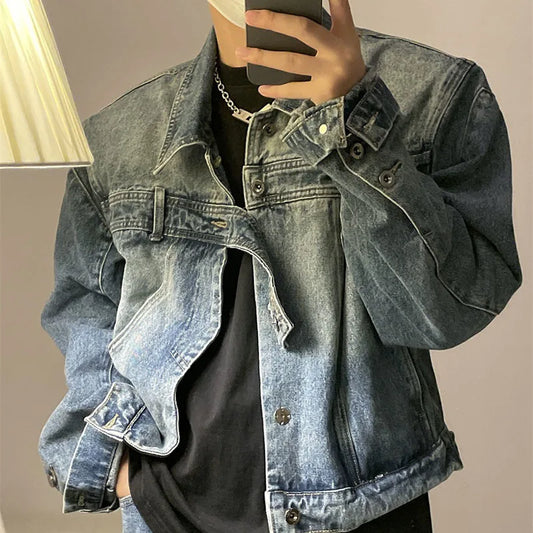 saferido Men's Design Denim Jacket American 2023 Vintage Turn-down Collar Belt Design Single Breasted Male Coat High Street 24X1972