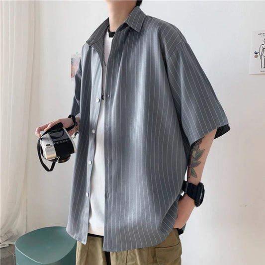 saferido Rocking k Summer Stripe Shirt Men's Korean fashion ins short sleeve shirt men's BF Harajuku handsome top loose casual coat