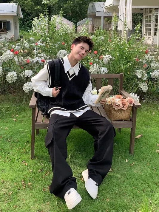 V Neck Knit Sweater Male Black Waistcoat Striped Brown Vest Men's Clothing Sleeveless Aesthetic Meme Old Korean Autumn Clothes A