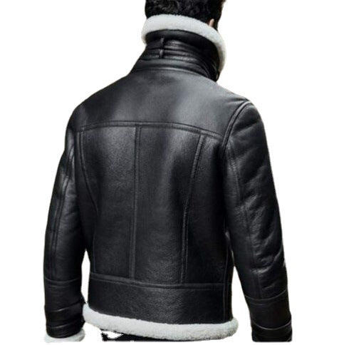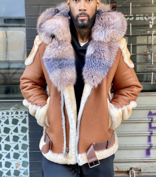 2025 Hot Trade Winter Men's Fur Collar Casual Hooded Jacket Lapel Fleece Slim Leather Jacket