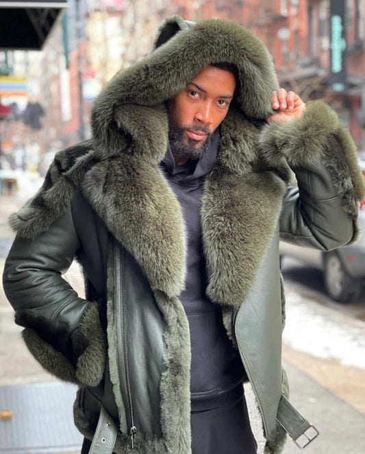2025 New wish green big fur collar hooded thickened velvet men's leather jacket 6559