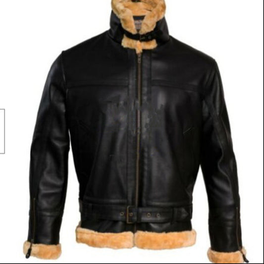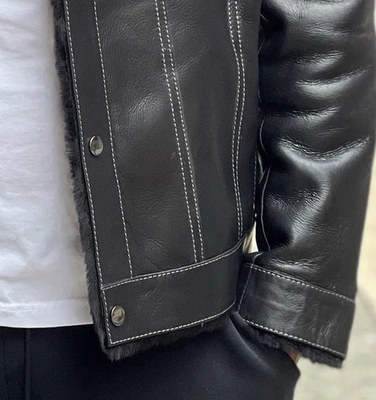 2025 New wish New black fur collar plush thickened men's leather jacket 6571