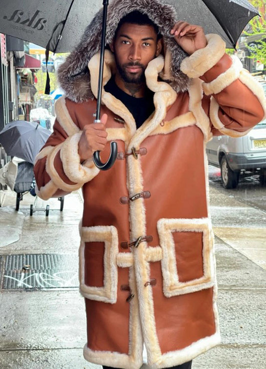 2025 New wish New brown big fur collar hooded horn buckle men's long leather jacket 6574