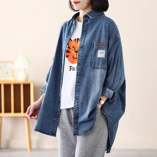autumn new denim shirt jacket women's POLO collar casual literary age reduction loose and thin large size shirt