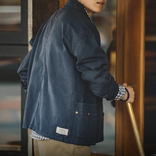Spring Vintage Asymmetric Pockets Men's Jackets Amekaji 100% Cotton Navy Blue Outerwears Casual Essential Washed Coat