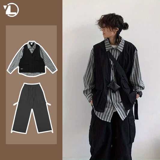 Spring New Japanese Set Mens Fake Two Pieces Striped Tooling Shirts+casual Wide Leg Pants 2-Pcs Set College Retro Suit Unisex