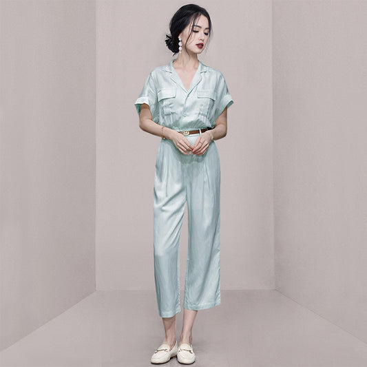 Summer women's new light blue tooling wind cotton and linen jumpsuit jumpsuit wide-leg pants nine-point pants