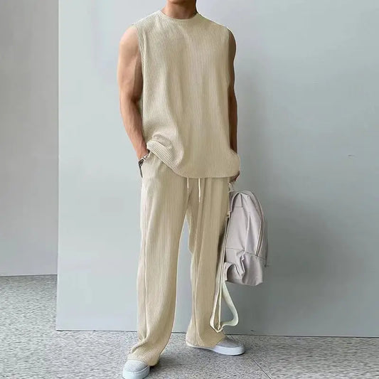 Fashion Solid Two Piece Suits Men‘s O-Neck Sleeveless Tops And Pants Outfits Men Summer New Casual Simplicity Solid Rib Sets