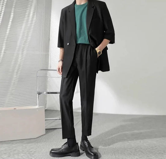 Korean Style New Men's Short Sleeve Suits Long Pants Sets Fashion Casual Male Solid All-match Two Piece Sets S-5XL