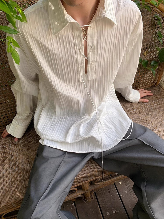 Korean style niche pleated textured drawstring shirt men spring and autumn new casual loose versatile long-sleeved shirt