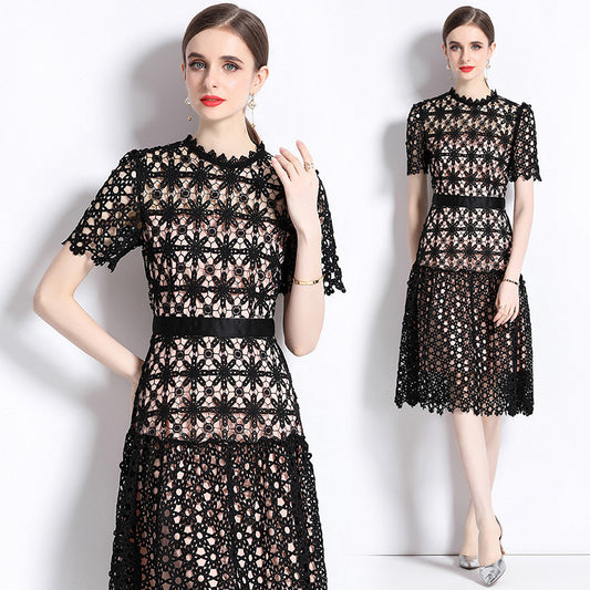 Light and mature style design sense retro niche sexy hollow lace short-sleeved dress women's summer new