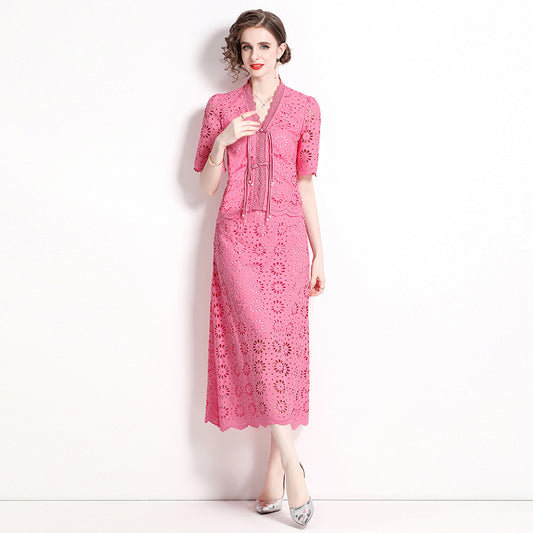 Live stream with goods Internet celebrity Popular style lace retro skirt set fashion buckle short sleeve top long skirt two-piece set