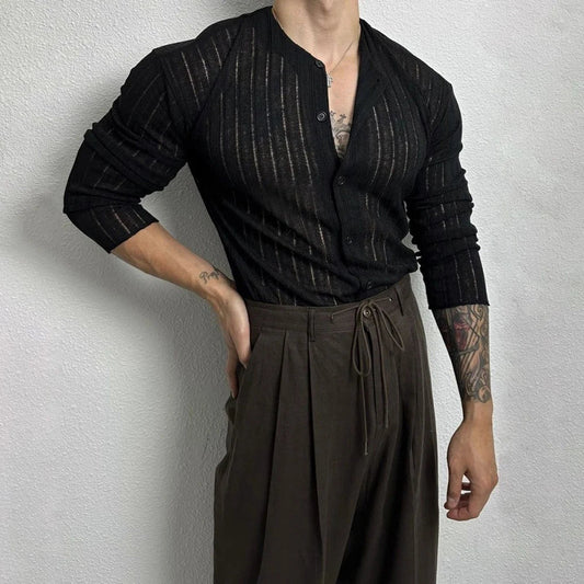Mens Autumn Sexy Hollow See-Through Knitted Shirt New Essential Casual Loose Lazy Style Solid Color Long-Sleeve Shirt For Men