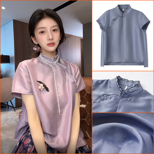 New Chinese style mulberry silk high-end shirt women's summer new chic diagonal placket buckle lace top N4002
