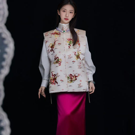 New Chinese style light luxury stand-up collar bead embroidery sleeveless sequins loose shirt vest long skirt set MZ055
