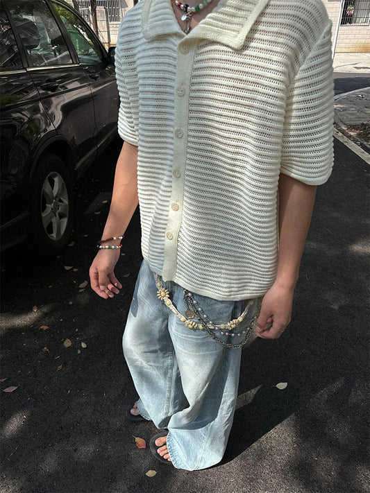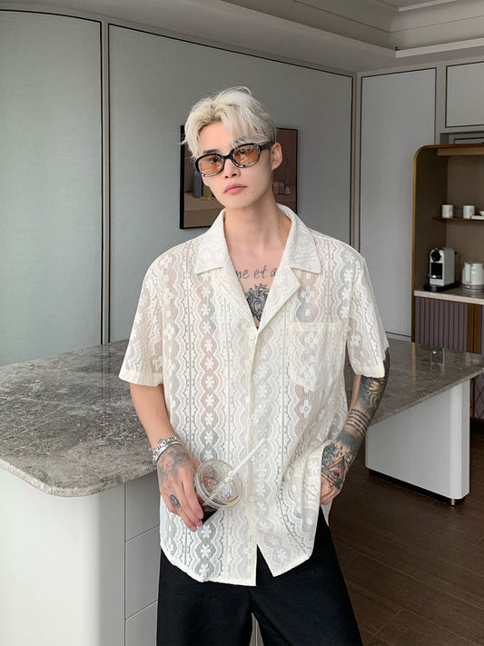 Niche retro jacquard hollow design short-sleeved shirt men summer new lazy style lapel shirt trend