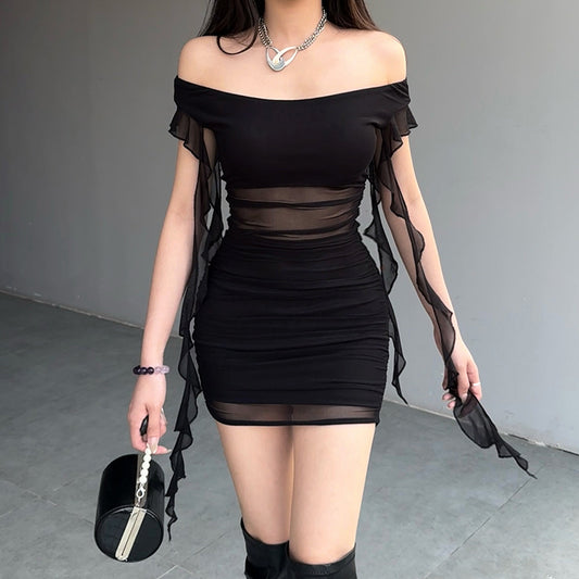 2025 style popular summer new women's clothing solid color sexy spice girl neck slim waist mesh dress