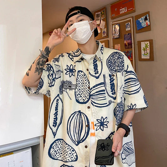 Print Shirts Men Fashion Streetwear Handsome Summer Half Sleeve Turn-down Collar Korean Style Teenagers Popular Youthful Hipster