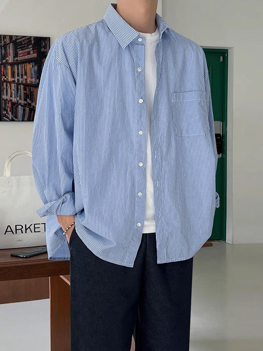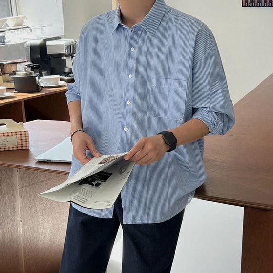 saferido -shop 90s fashion men Korean Style Casual Shirt Light Mature Loose Blue Loose Long Sleeve Shirt Thin Striped Spring and Autumn New Men's Korean Style