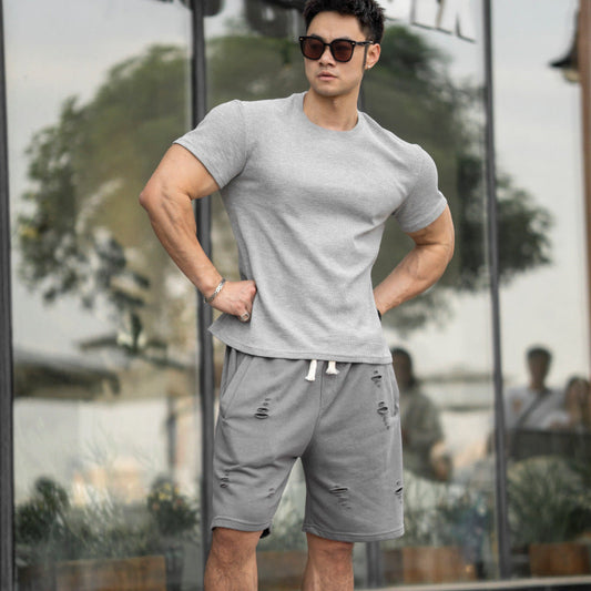 saferido -shop masculine men American-Style Thickened Fitness Men's Summer round Neck Short Sleeve Stretch Slim Fit Sports Trendy Bodybuilding Outdoor Quick-Drying T-shirt
