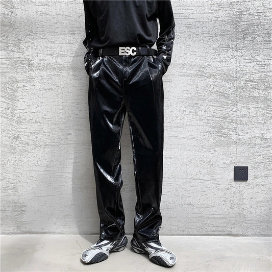 saferido British Style Net Trend Personality Streetwear Bright PU Leather Trousers Side Tight Waist Loose Casual Pants Men's S-2XL