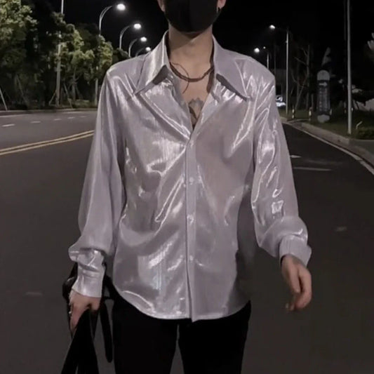 saferido Autumn Mens Glossy Shoulder Pad Design Lapel Silver Solid Color Top Y2K Korean Style Trendy Casual Loose Long-Sleeved Shirt