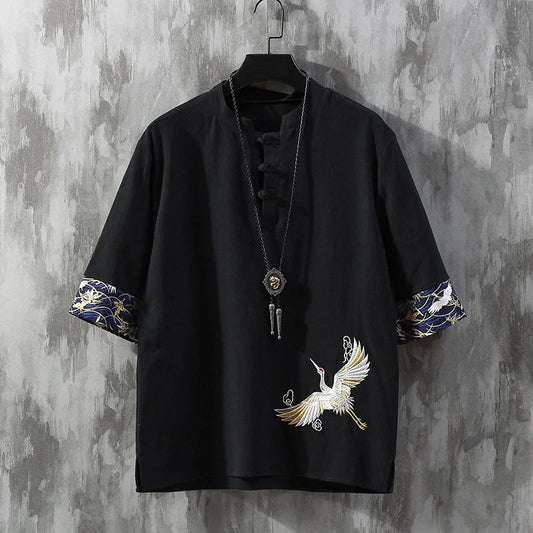 saferido Chinese Style Disc Button Linen T-shirt Mens Summer Short-sleeved Tang Shirt Loose Large Size T-shirt Japanese Kimono Men New
