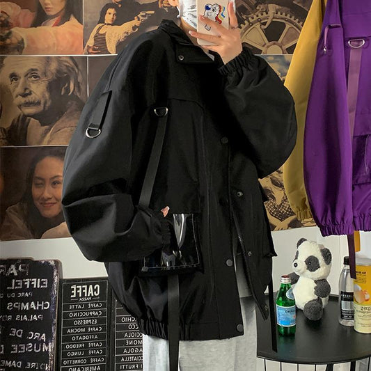 saferido fall fits men Functional Style Ribbon Workwear Jacket Men's Spring and Autumn Pu Shuai Fried Street Korean Style Trendy Loose Jacket